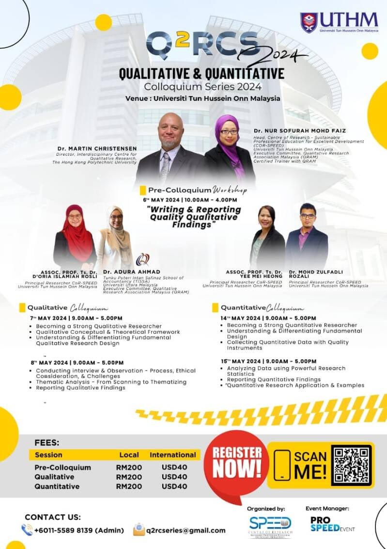 This year, we're excited to go beyond the ordinary by inviting TWO esteemed guests from last year's International Qualitative Research Conference (IQRC) organized by the Qualitative Research Association Malaysia (QRAM). Let's give a warm welcome to Dr. Martin Christensen and Dr. Adura Ahmad, who will join our team to offer you better, broader, and deeper insights into various disciplines of the qualitative research world.